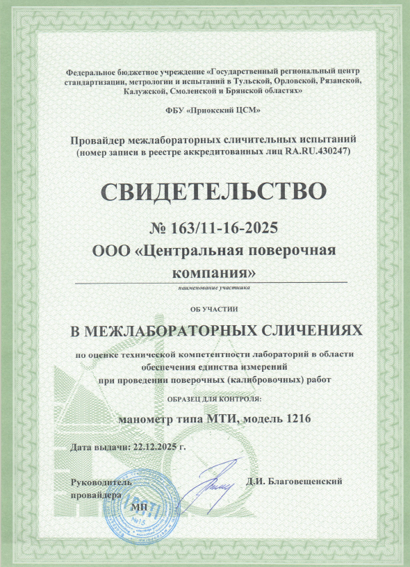 Метрологическая лаборатория ООО «ЦПК» успешно прошла межлабораторные сличительные испытания (МСИ) по измерениям давления, организованные провайдером ФБУ «Приокский ЦСМ».